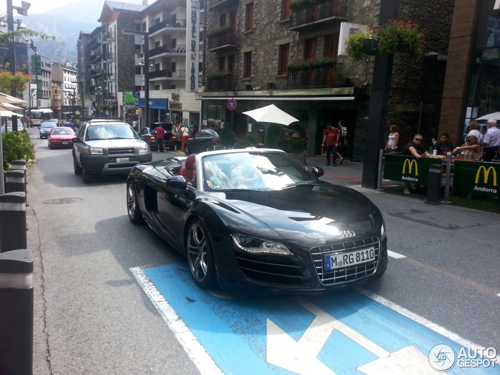 | Audi R8 V10 Spyder xuất hiện ở Andorra la Vella, Andorra. Phiên bản mui trần của mẫu R8 V10 được trang bị động cơ 5.2 lít V10, công suất cực đại 525 mã lực tại vòng tua 8.000 vòng/phút và mô-men xoắn cực đại 530 Nm tại vòng tua 6.500 vòng/phút kết hợp hộp số tay 6 cấp hoặc hộp số ly hợp kép 7 cấp. |