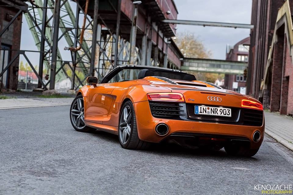 | Audi R8 V10 Spyder màu đẹp. Siêu xe được trang bị động cơ V10 5,2 lít, công suất 525 mã lực tại 8.000 vòng/phút và mô-men xoắn cực đại 391 Nm tại 6.500 vòng/phút, giúp xe có thể tăng tốc từ 0-100 km/h trong 4,1 giây, và đạt tốc độ tối da 317 km/h. |
