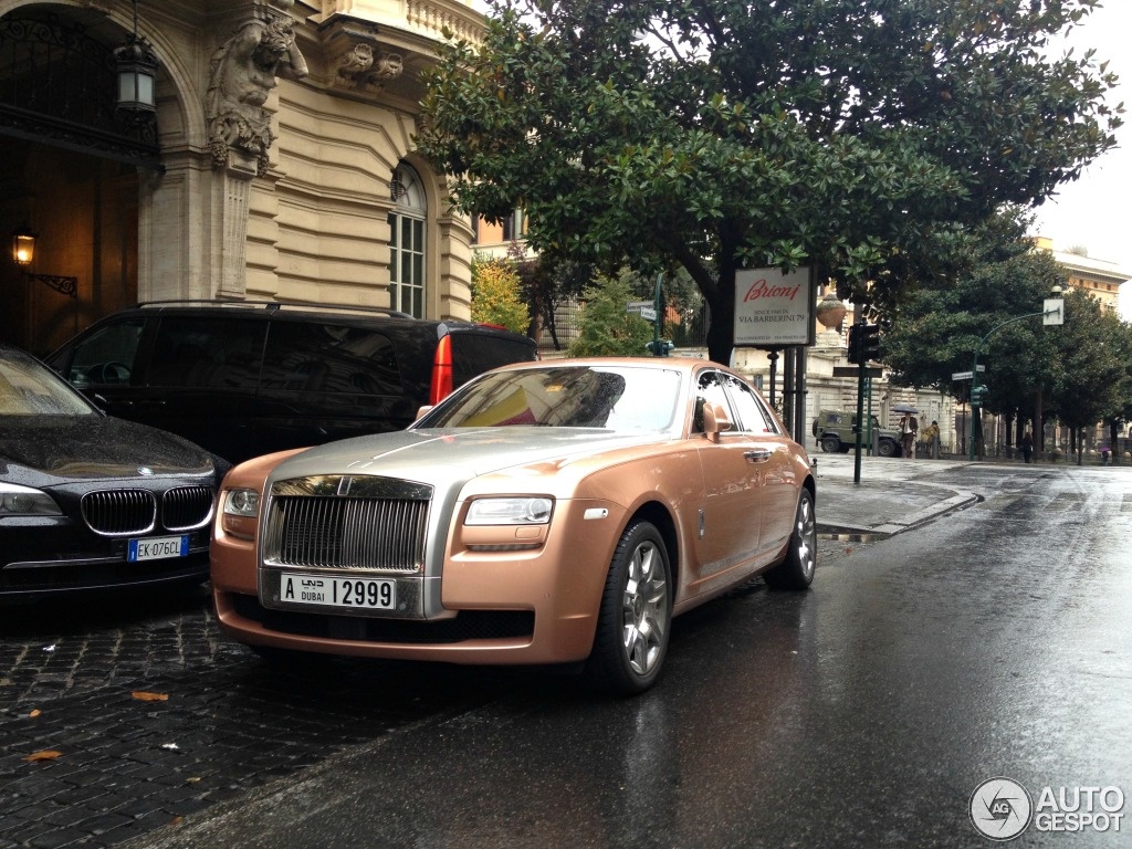 Rolls-Royce Ghost màu đẹp ở Rome, Italia. Siêu xe được trang bị động cơ công suất 570 mã lực, mô-men xoắn cực đại 780 Nm tại 1.500 vòng/phút, cho khả năng tăng tốc 0-100 km/h trong 4,9 giây, tốc độ tối đa 250 km/h.