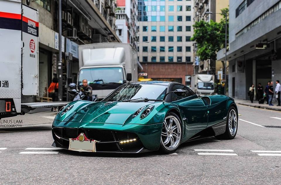 | Pagani Huayra màu xanh duy nhất trên thế giới xuất hiện ở Hong Kong. Siêu xe có tên gọi là "Thần gió" ra mắt năm 2012, được trang bị động cơ V12 6.0 lít, sản sinh công suất 730 mã lực, mô-men xoắn cực đại 1.000 Nm cho khả năng tăng tốc 0-100 km/h trong 3,3 giây, tốc độ tối đa đạt 372 km/h. Pagani Huayra có giá bán đến 1,3 triệu USD. |