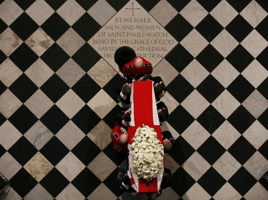 | Binh sĩ rước quan tài của cựu Thủ tướng Anh Margaret Thatcher ra khỏi nhà thờ St Paul (London) vào cuối tang lễ ngày 17/4. Ảnh: AFP. |