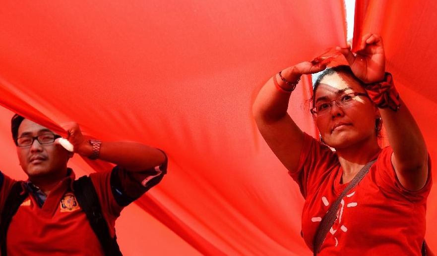 | Những người Thái ủng hộ phe áo đỏ đang đang kéo dải duy băng tại giao lộ Ratchaprasong trong cuộc biểu tình tại Bangkok ngày 10/11. Ảnh: AFP. |