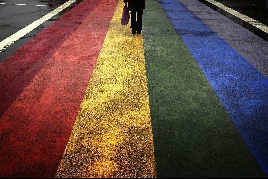 | Người đi bộ đang qua đường tại phố Oxford, Sydney (Australia) ngày 4/4. Vạch qua đường sặc sỡ sắc màu. Ảnh: AFP. |