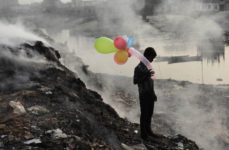 | Một cậu bé đang chơi cùng bóng bay bên bờ sông Buriganga lúc hoàng hôn khi khói bốc nghi ngút từ bãi rác cạnh nơi cậu đang đứng tại Dhaka (Bangladesh) ngày 19/1. Ảnh: AFP. |