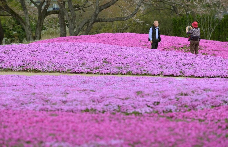 | Một cặp đôi cao tuổi đang chụp hình tại vườn hoa đầy sắc màu tại Tatebayashi, tỉnh Gunma (Nhật Bản) ngày 7/4. Ảnh: AFP. |