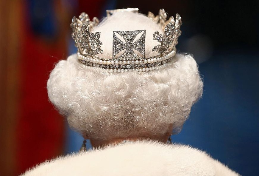 | Nữ hoàng Elizabeth II đội vương miện bạc, tóc bạc phơ và vận áo trắng tại cung điện Westmington ngày 8/5. Ảnh: AFP. |