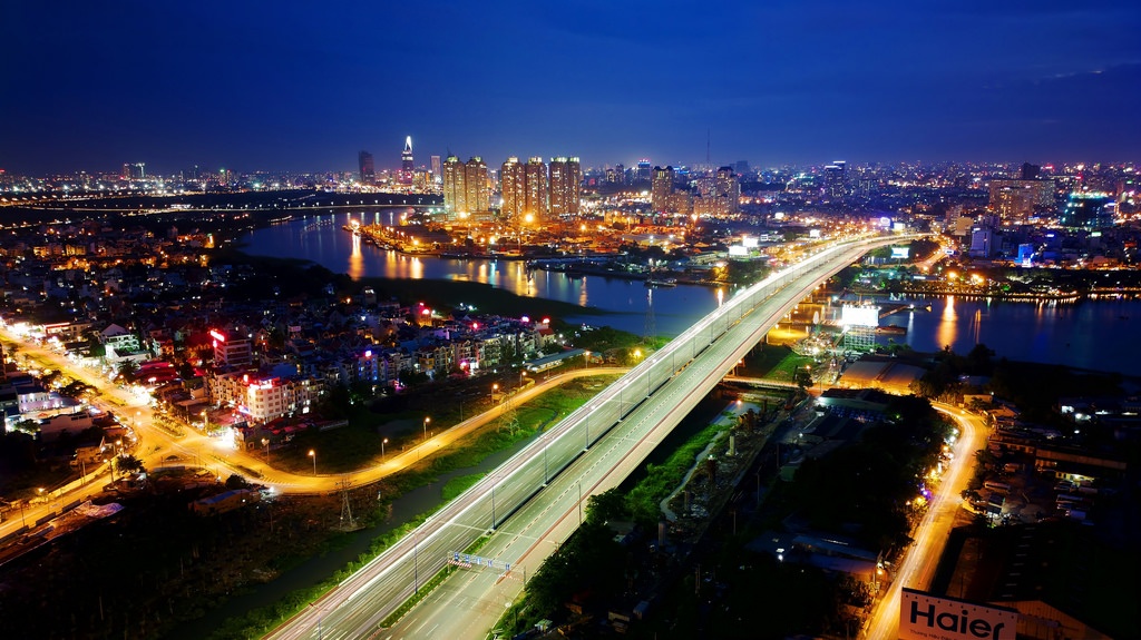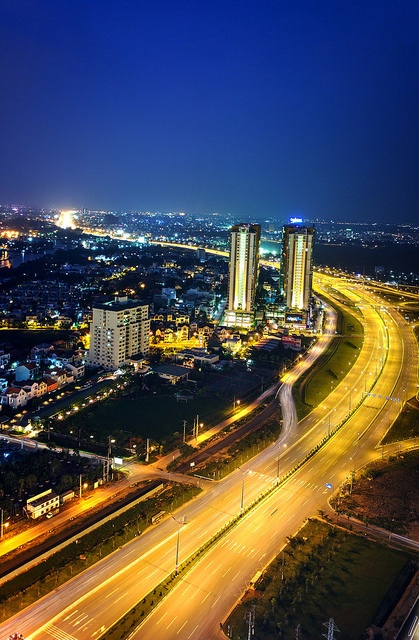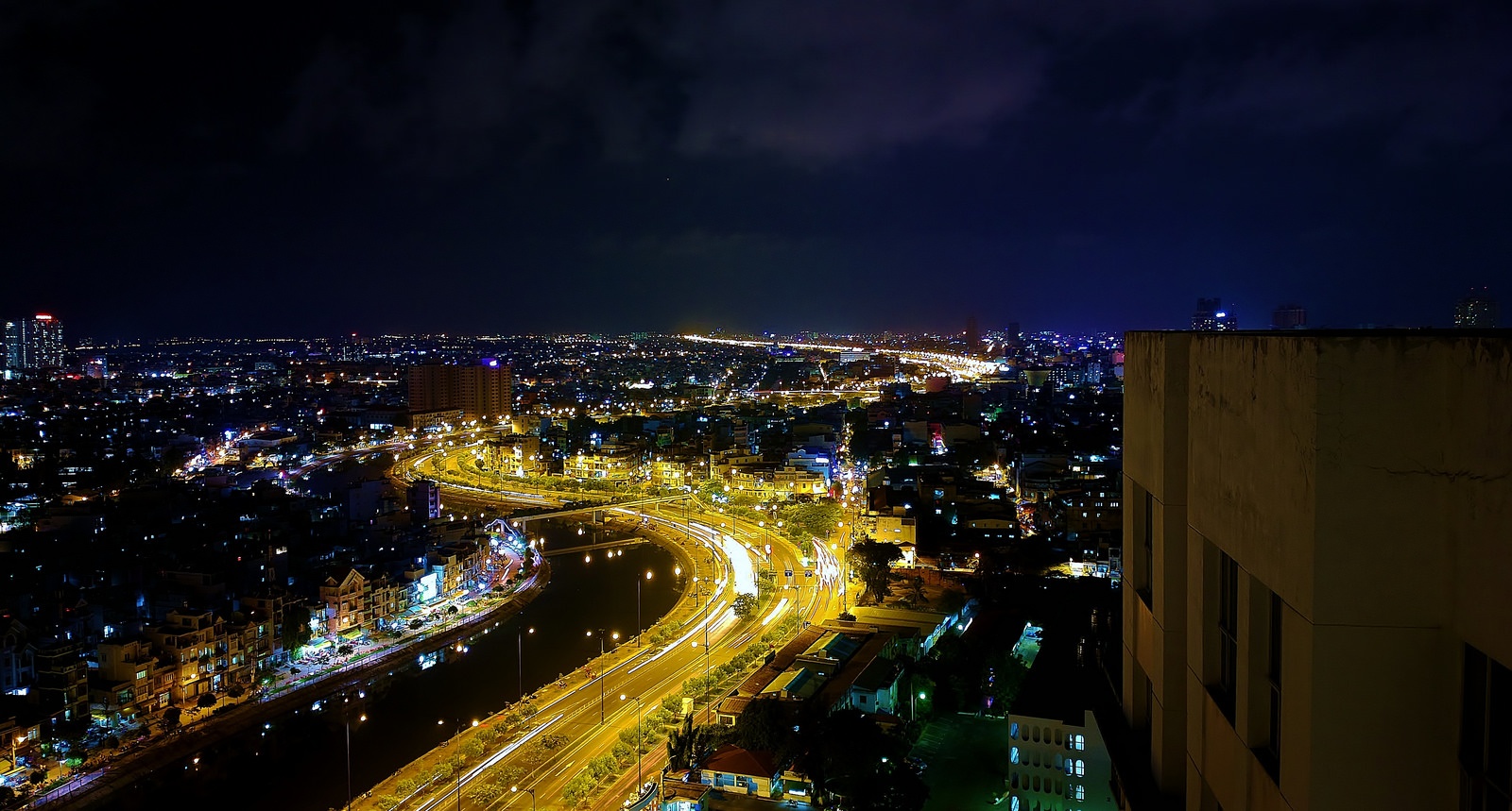 | Để có được những bức ảnh phơi sáng này, Nguyễn Thành Nam để ISO thấp và tốc độ chụp rất chậm khoảng 2 - 3 giây. Trong hình là Đại lộ Đông Tây nhìn từ phía quận 1. |