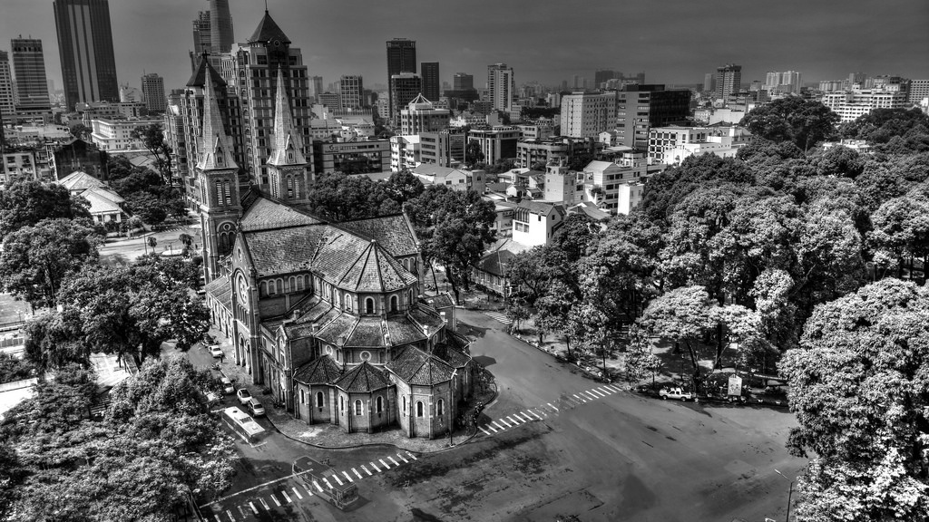 | Nhà thờ Đức Bà nhìn lạ lẫm với tông màu đen trắng. Ảnh chụp với tốc độ 1/143 giây, ISO 64. |