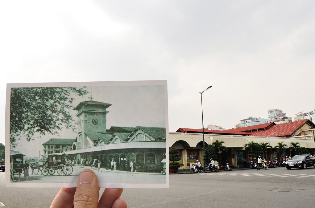 Chợ Bến Thành năm 1922 và hiện nay. Đây là một trong những địa điểm tiêu biểu của TP HCM. Trong một số trường hợp, cửa phía nam khu chợ được coi là biểu tượng của thành phố. |