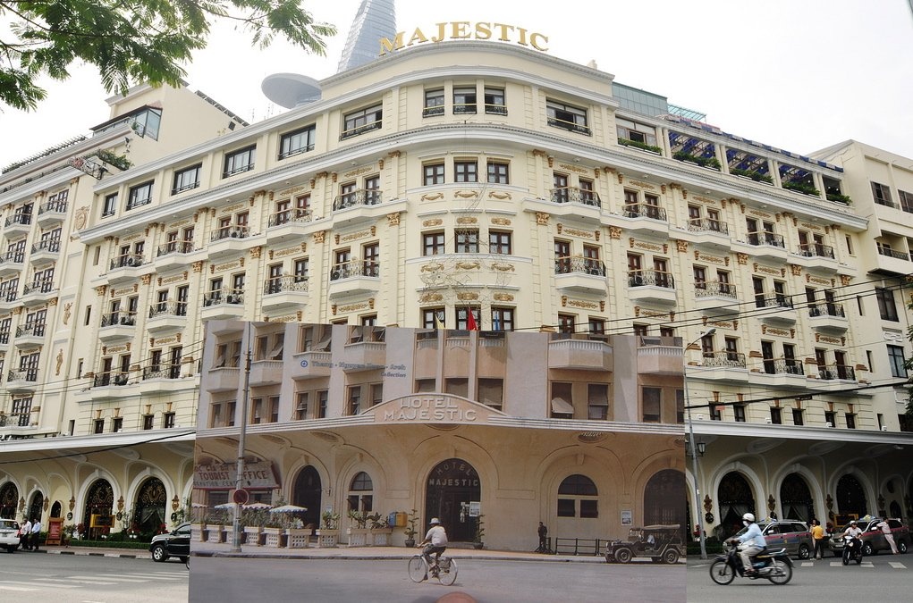 Khách sạn Majestic năm 1966. Khách sạn 5 sao được xây dựng theo phong cách kiến trúc Pháp giữa trung tâm Sài Gòn. Nó tồn tại suốt gần một thế kỷ qua. |