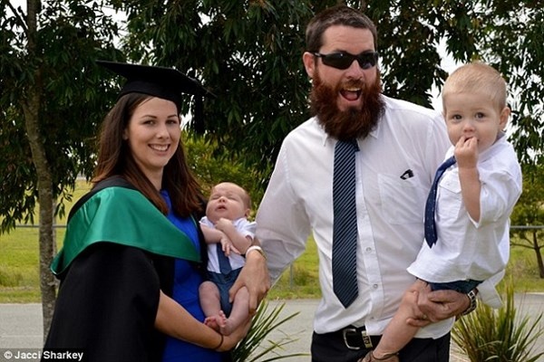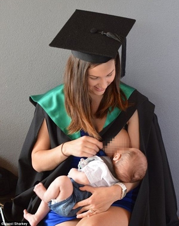 Jacci Sharkey, 24 tuổi, mang đứa con Alek 6 tuần tuổi đến dự lễ tốt nghiệp. Người mẹ này không ngần ngại cho con bú trước đông người. Bức ảnh được ĐH Sunshine Coast (bắc Brisbane, Úc) đăng lên trang Fanpage chính thức, thu hút hơn 195.000 lượt like (thích) trên Facebook, gần 600 lượt chia sẻ.