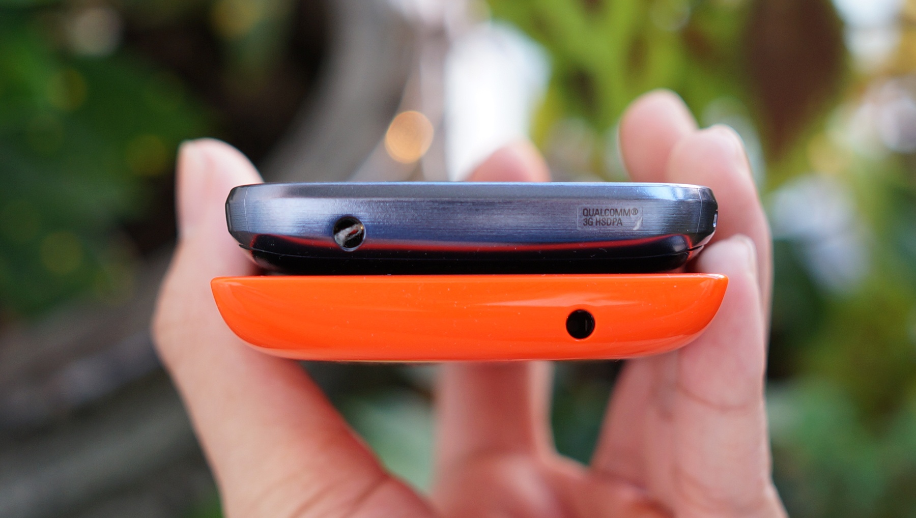 | Khe cắm thẻ nhớ của Trend Plus được bố trí ở bên ngoài, trong khi Lumia 525 lại "giấu" bộ phận này ở bên trong để không ảnh hưởng đến thiết kế giả nguyên khối của máy. |