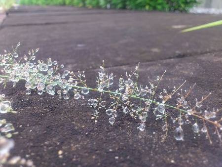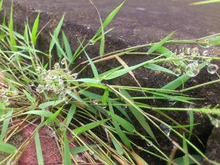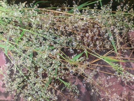 | Những giọt sương trong veo đọng trên một gọng cỏ. |