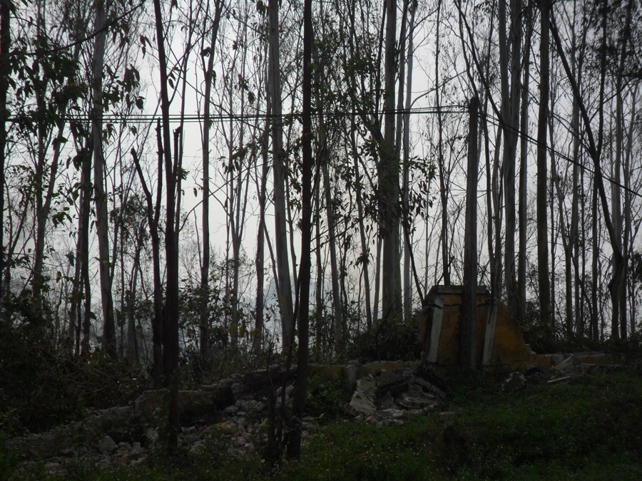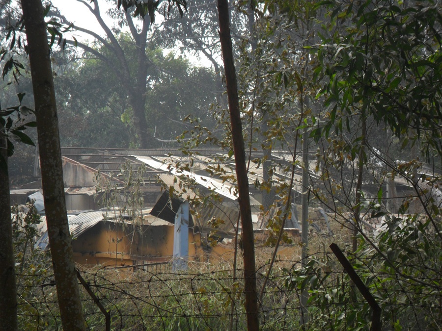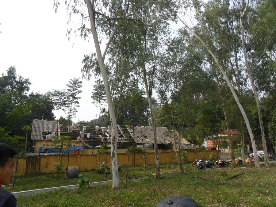 | Tường rào quanh kho nhà máy đổ nát. Cây cối khu vực xung quanh chịu sức ép của vụ nổ cũng tơi tả, lá rụng trơ cành. |