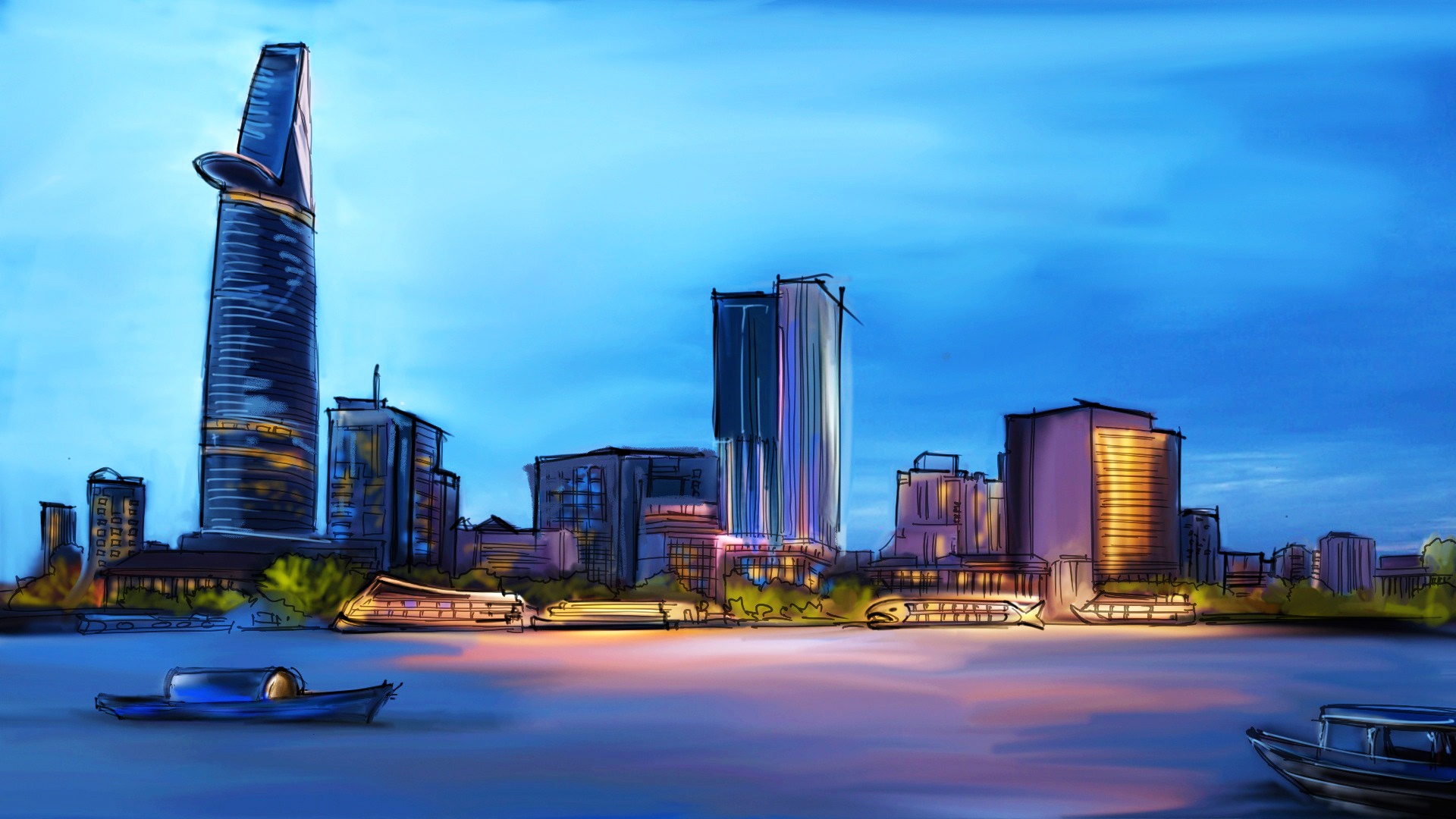 | Phần lớn các bức hình đều được anh Thơ vẽ lại dựa trên một tấm ảnh nhìn trước. Tuy nhiên, các đường nét đều được xử lý lại, cũng như thêm các chi tiết trong bối cảnh. Đây là hình ảnh nhìn từ quận 2 sang Sài Gòn, dòng sông được làm mềm hơn kết hợp với các con thuyền nhỏ. |