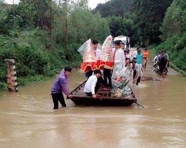 | "Dù ngày trọng đại diễn ra với điều kiện khó khăn, các cặp đôi vẫn rất rạng ngời trong niềm vui và hạnh phúc như quên đi mọi chuyện của mưa lũ" - thành viên Thông Lao chia sẻ. Ảnh chú rể cõng cô dâu trên lưng được ghi lại tại Lục Ngạn, Bắc Giang. Ảnh: Thông Lao. |