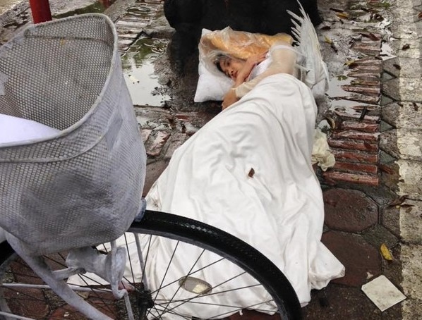 Hình ảnh cô gái mặc váy trắng, đeo cánh thiên nằm trên đường phố Hà Nội khi trời mưa hiện được lan truyền trên mạng. Hành động lạ này khiến nhiều người tò mò và nhanh chóng truy tìm thông tin về thiếu nữ. Theo đó, nhân vật chính trong ảnh là nhà thơ Hoàng Ly. Cô cho biết, đây là một phần trình diễn nghệ thuật đương đại do nhà sàn Collective cộng tác với hai nghệ sĩ Việt Nam tổ chức. Ảnh: Hoàng Ly.