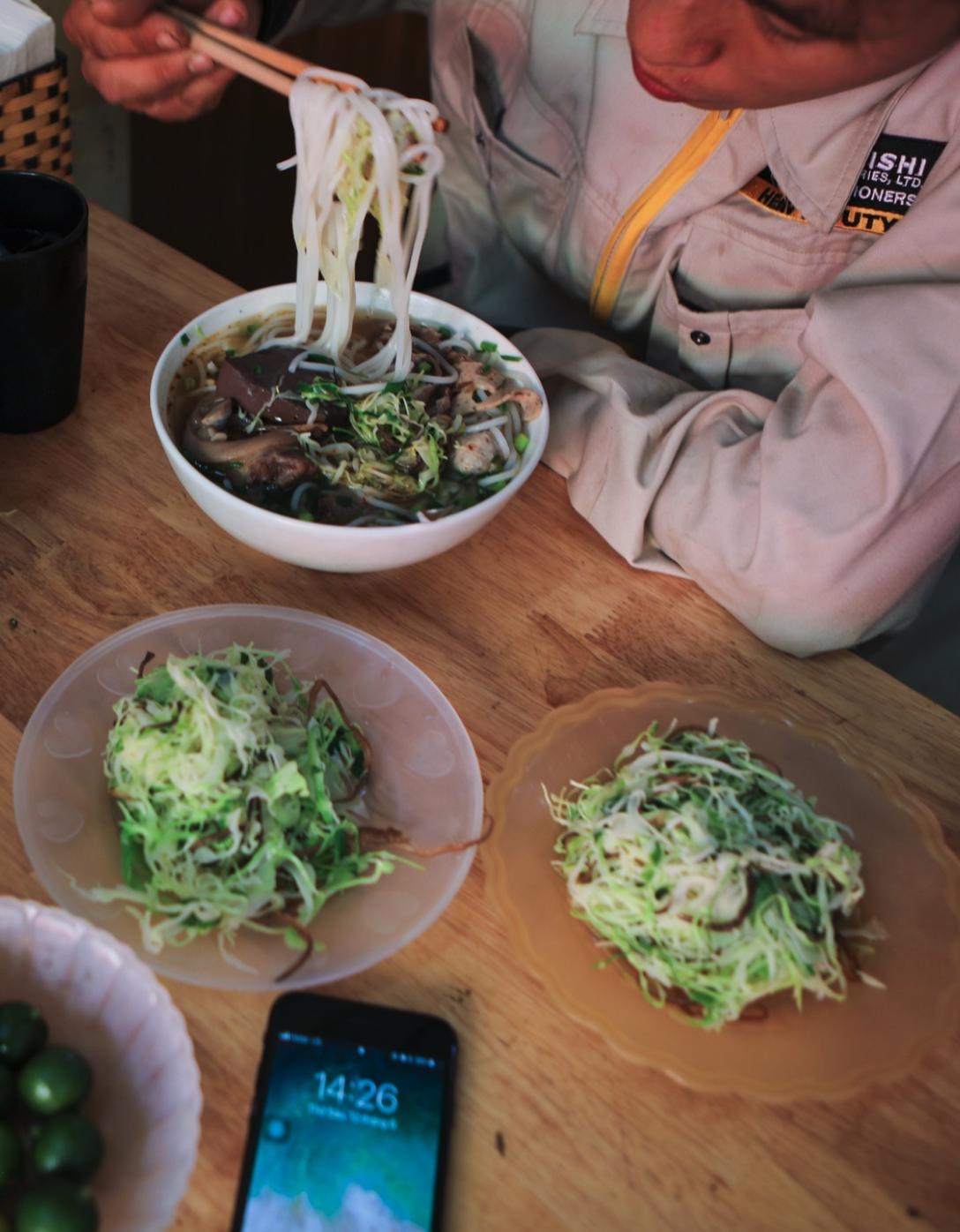 | Gần 14h30, tôi và các anh em trong đội mới được ăn bữa trưa. Tôi chọn ăn bún vì ăn cơm bình dân trong thời tiết 40 độ C khá khó nuốt. |