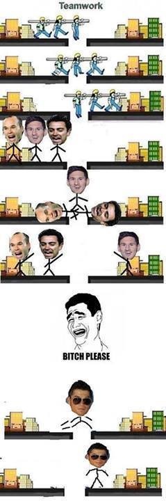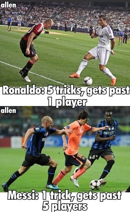 | Ronaldo cần 5 cú đảo chân để qua một hậu vệ, Messi thì 1 cú đi bóng để qua 5 cầu thủ. |