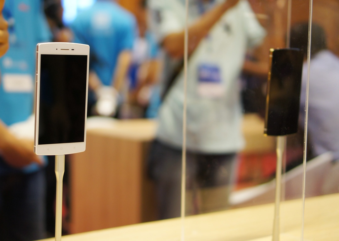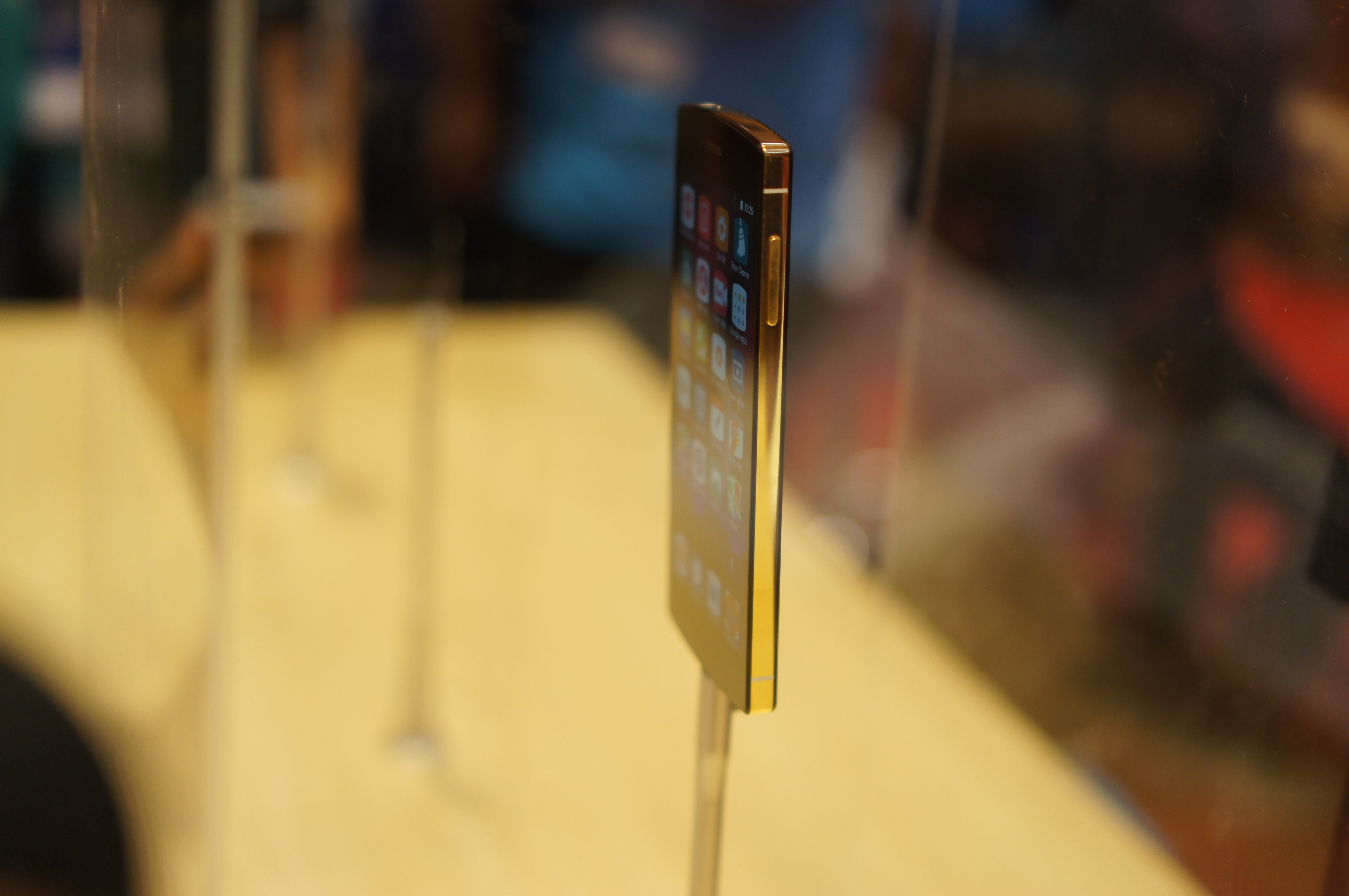 | Trong khu trưng bày sản phẩm, Bphone mạ vàng được chụp lồng kính. Bên cạnh nó là Bphone bản màu trắng, viền vàng champagne. Model này có dung lượng 64 GB, giá 12,96 triệu đồng chưa thuế. |