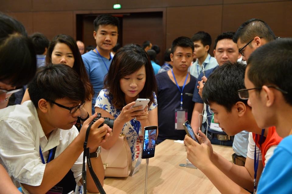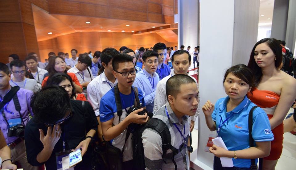 | Sau sự kiện ra mắt Bphone, các khách mời đã ở lại, xếp hàng vào khu trải nghiệm sản phẩm. |
