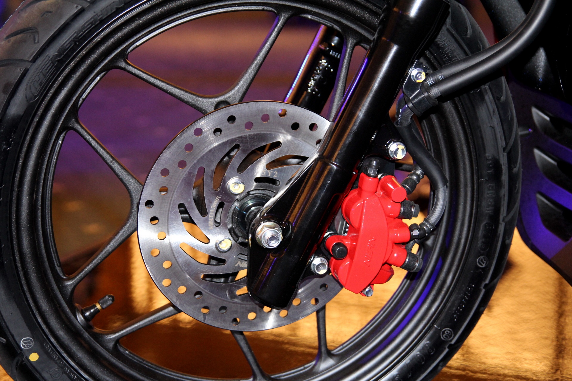 | Kẹp phanh trước trên cả hai mẫu xe đều sơn đỏ, lấy cảm hứng từ những chiếc xe hơi thể thao. Phuộc trước được sơn đen bóng và vành sơn đen tĩnh điện. |