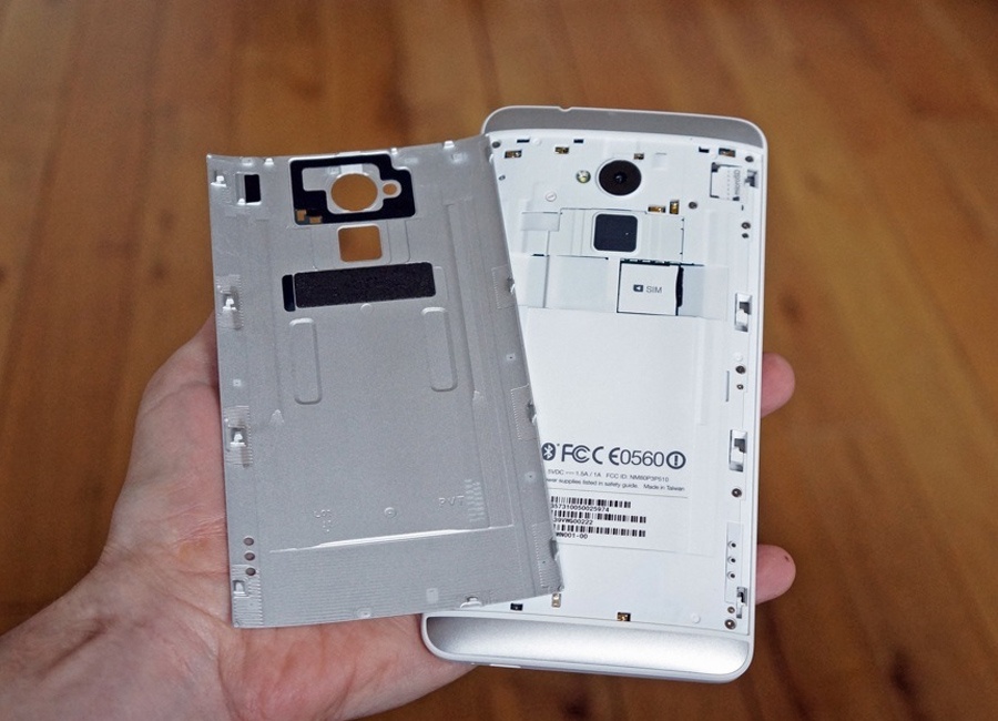| Khe cắm thẻ SIM của One Max đã được đưa ra mặt sau, bên dưới nắp nhôm. |
