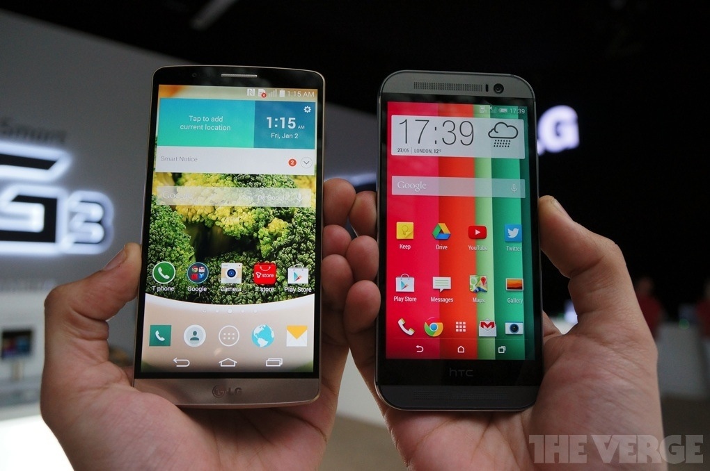 | LG G3 có màn hình rộng và độ phủ mặt trước cao hơn so với HTC One M8. |
