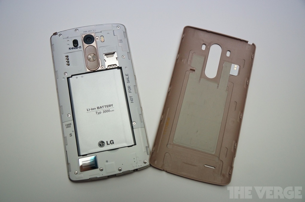 | LG G3 không sở hữu thiết kế nguyên khối. Máy có nắp lưng có thể mở và pin rời 3.000 mAh. |