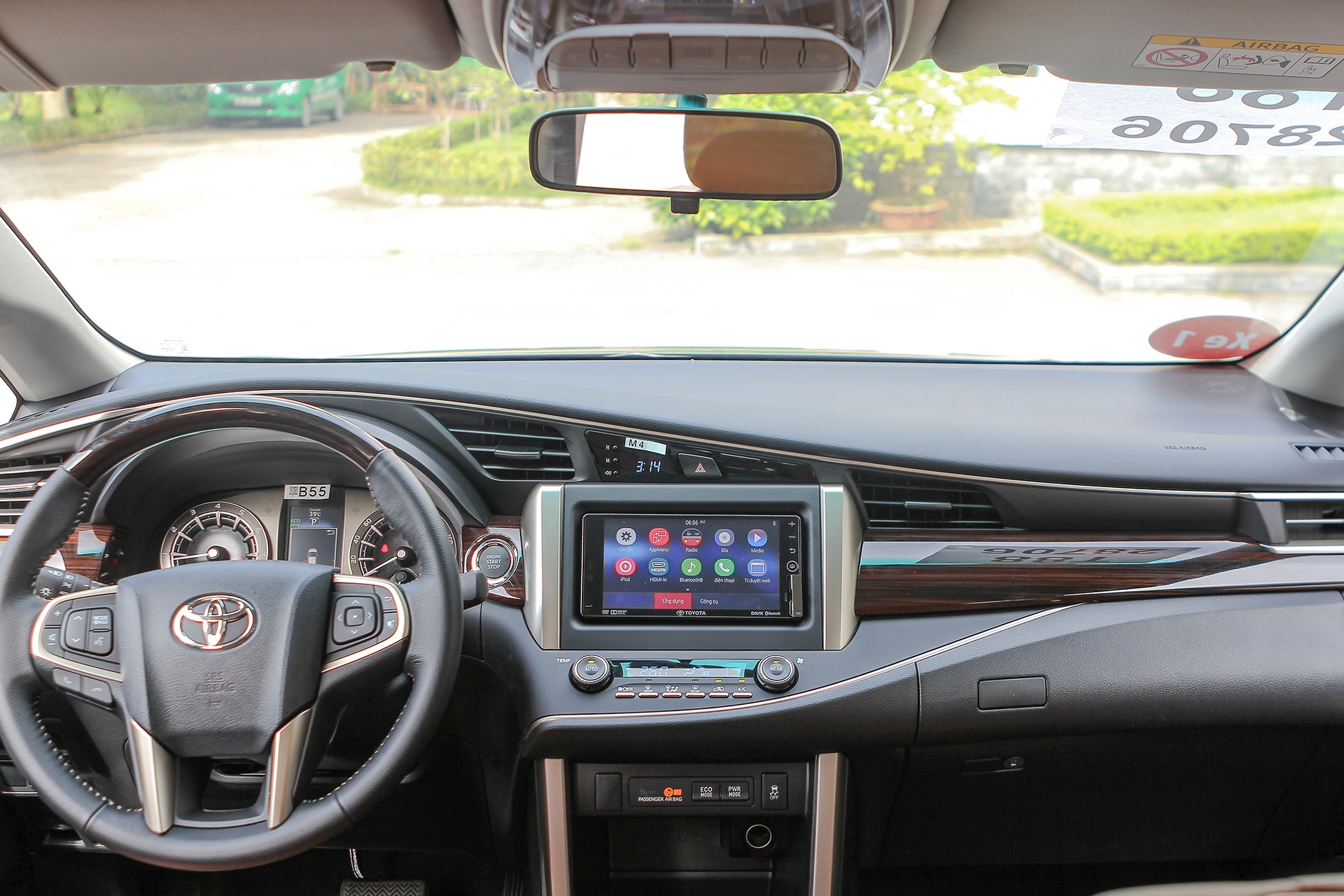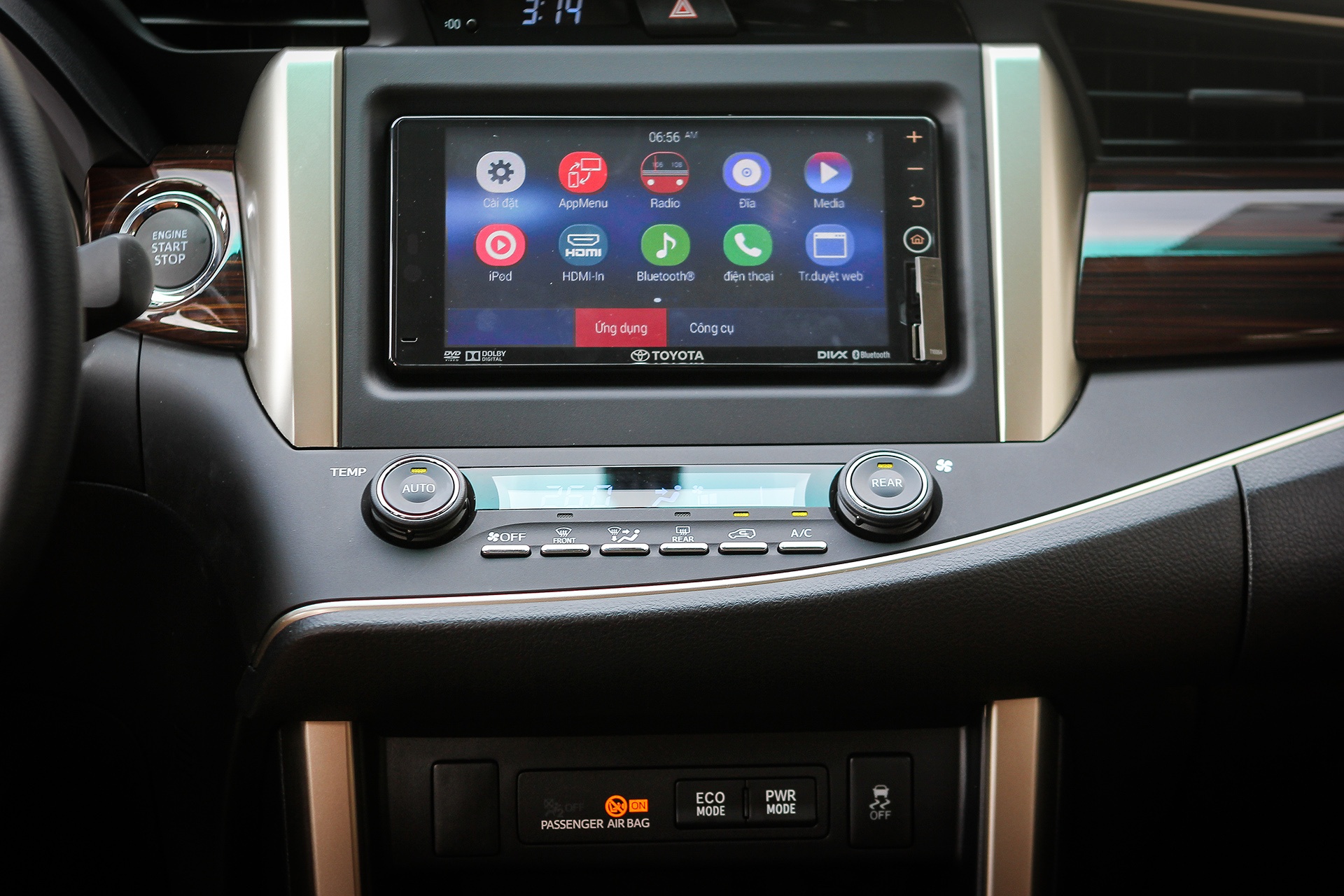 | Phiên bản cao cấp nhất Innova 2.0V trang bị màn hình cảm ứng kích thước 7 inch. Hệ thống giải trí gồm đầu DVD, âm thanh 6 loa cùng các kết nối thông dụng như AUX, USB, Bluetooth. Ngoài ra, mẫu MPV này còn có kết nối HDMI và Wifi. Người lái có thể lựa chọn các chế độ lái ECO và PWR thông qua nút bấm ở khu vực điều khiển trung tâm. Phiên bản 2.0V còn trang bị tính năng ổn định thân xe VSC, khởi động bằng nút bấm. |