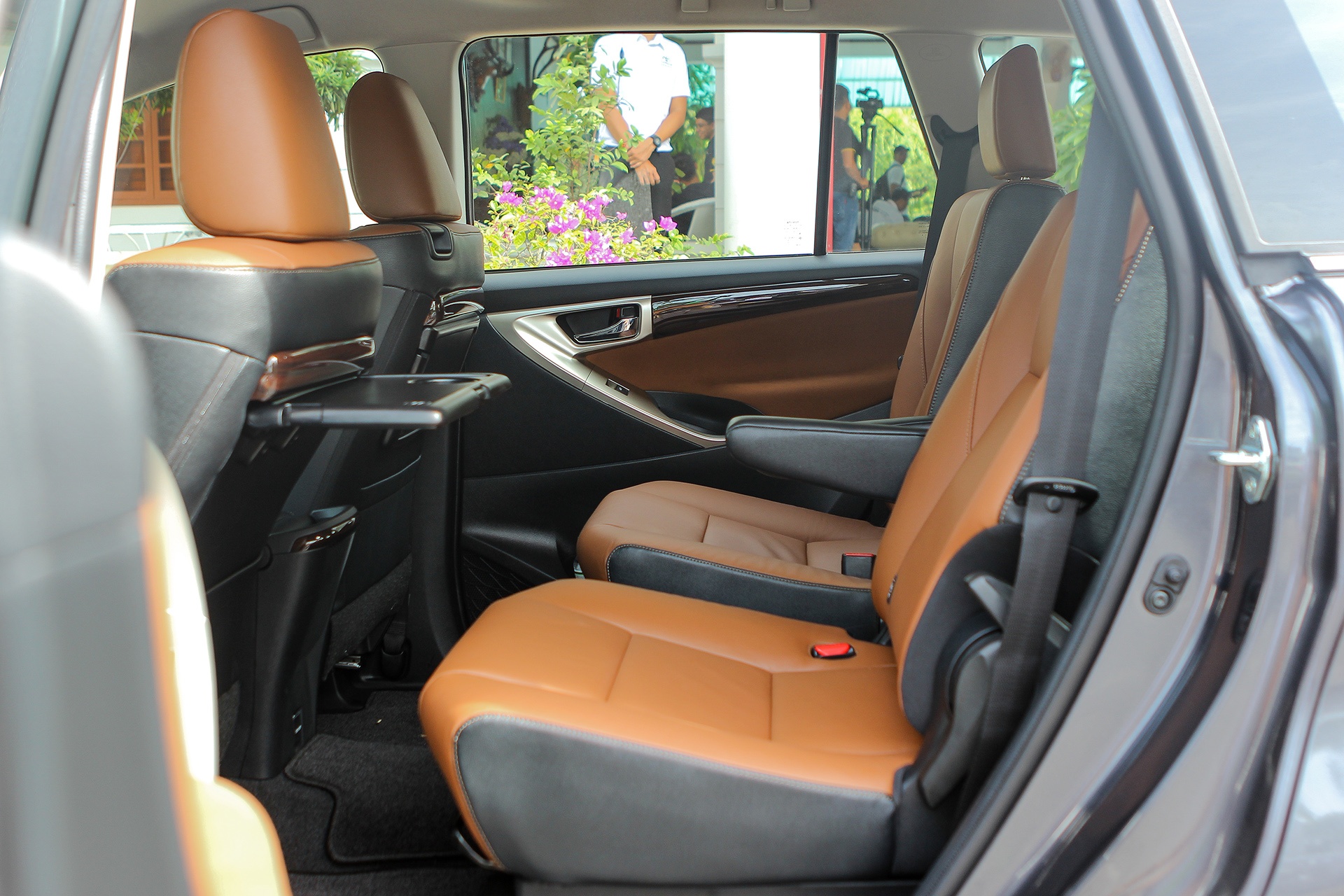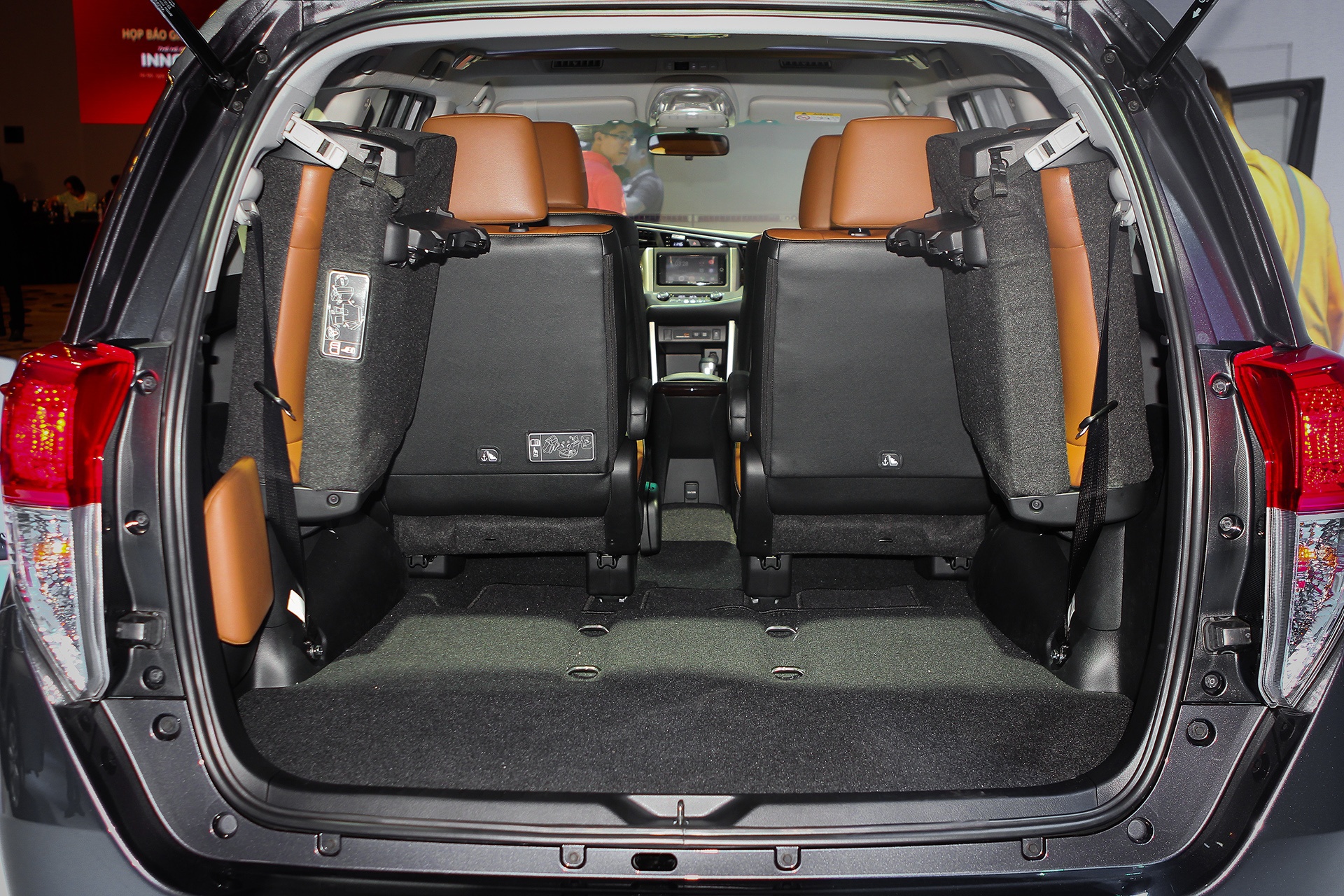 | Hàng ghế thứ 3 có thể gập gọn giúp tăng thêm diện tích khoang chứa đồ. Phiên bản Innova 2.0V 2016 nhắm đến tập khách hàng là gia đình. Do đó, xe được trang bị nhiều công nghệ an toàn cả chủ động và bị động. Những hệ thống nổi bật như chống bó cứng phanh, hỗ trợ phanh khẩn cấp, phân phối lực phanh điện tử, ổn định thân xe, hỗ trợ khởi hành ngang dốc... Hệ thống túi khí cho người lái, hành khách trước, túi khí đầu gối, rèm, bên hông. |