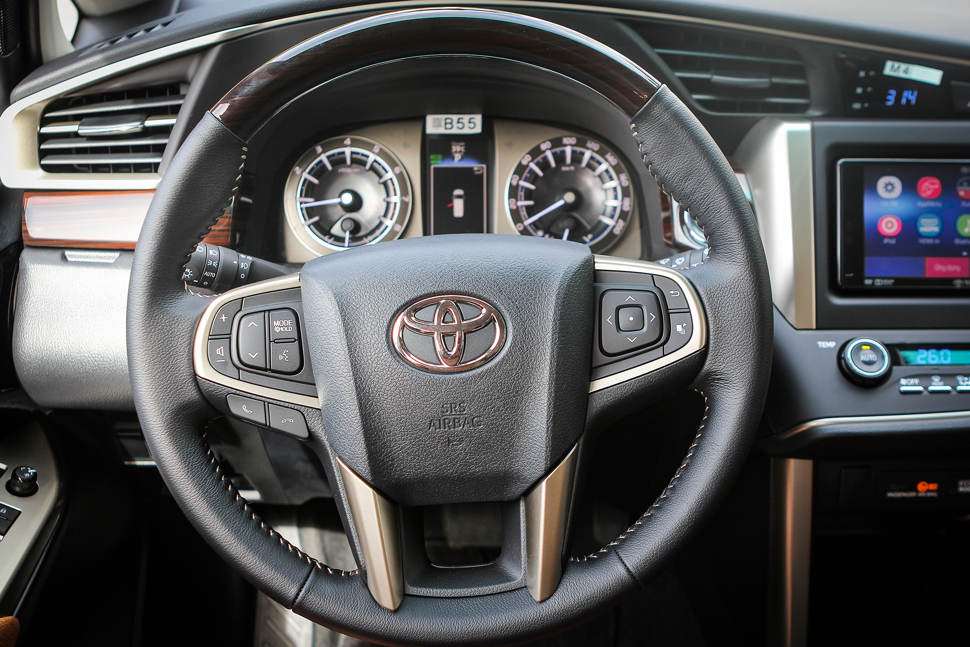 | Không gian nội thất của Innova 2.0V 2016 thay đổi hoàn toàn. Thiết kế mới sử dụng chất liệu da, ốp gỗ và mạ bạc cho cảm giác sang trọng như trên một số dòng xe sedan. Trong hành trình trải nghiệm chiếc xe trên quãng đường khoảng 100 km, Innova 2.0V 2016 thể hiện khả năng cách âm khá ấn tượng. |
