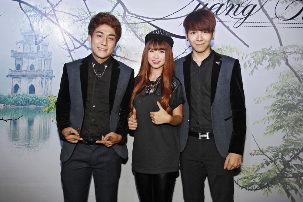 | Bên cạnh Anh Thúy là rất nhiều tên tuổi khác của showbiz Việt đến thưởng thức chương trình. Cô ca sĩ Khởi My chuẩn men bên hai chàng trai của nhóm La #. |