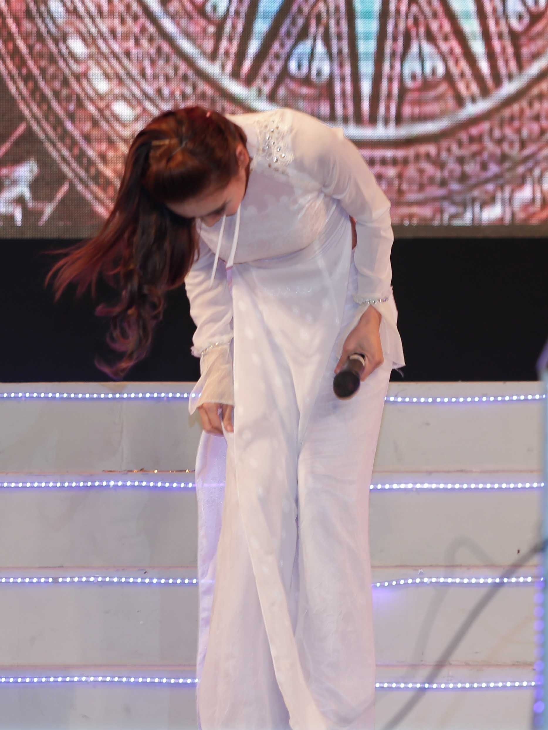 | Sau màn chào sân suôn sẻ, nữ ca sĩ giới thiệu cô vừa sáng tác một ca khúc về biển đảo quê hương và mong muốn gửi tặng đến khán giả. Tuy nhiên, ngay khi vừa bước xuống bậc thềm, cô đã bị vấp ngã và nằm lăn quay trên sân khấu. |