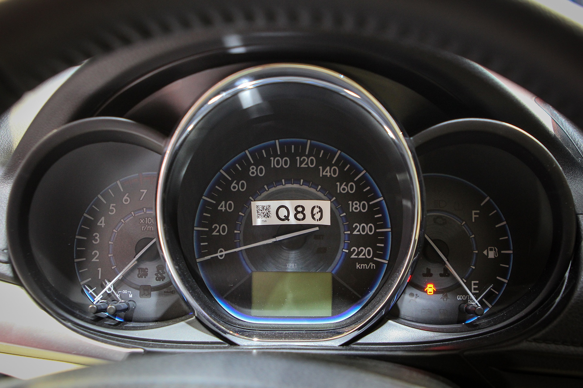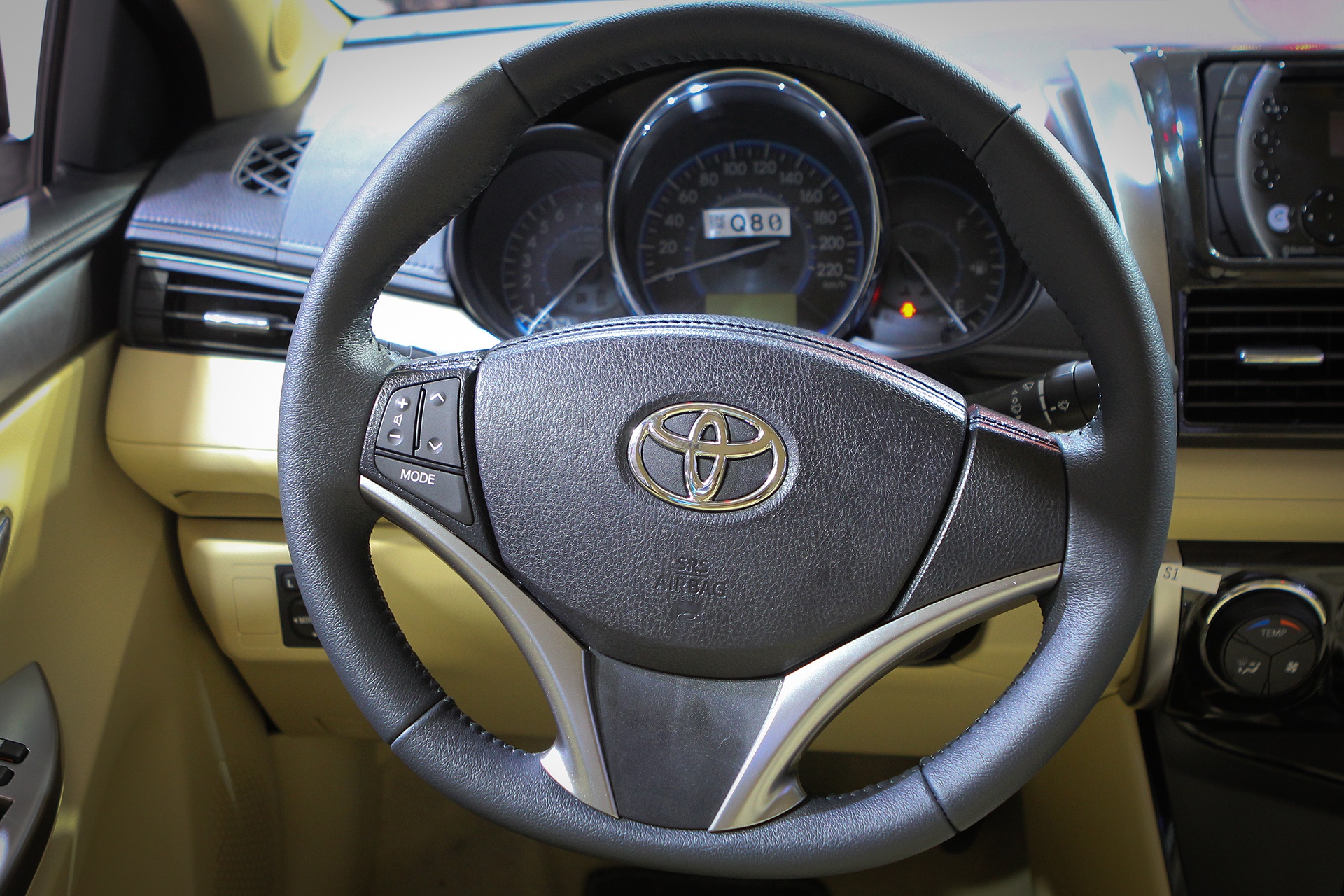 | Nội thất của Vios 2016 cũng được giữ nguyên. Bảng táp lô bọc vật liệu mềm trên phiên bản cao cấp 1.5G. Cụm điều khiển hệ thống đa phương tiện đặt giữa bảng táp lô. |