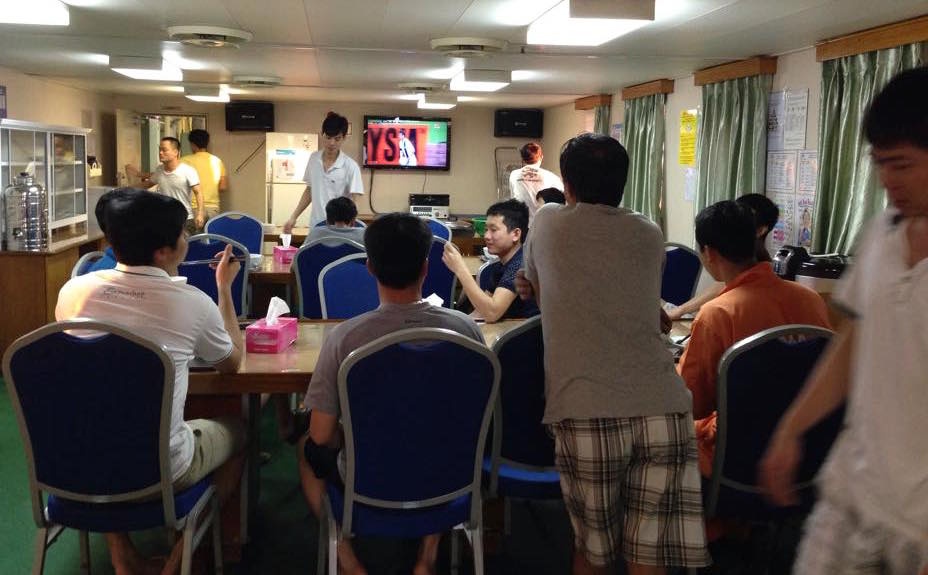 | Các thuyền viên trên tàu Brave theo dõi trận đấu U23 Việt Nam giành chiến thắng 7-0 trước U23 Macau. |