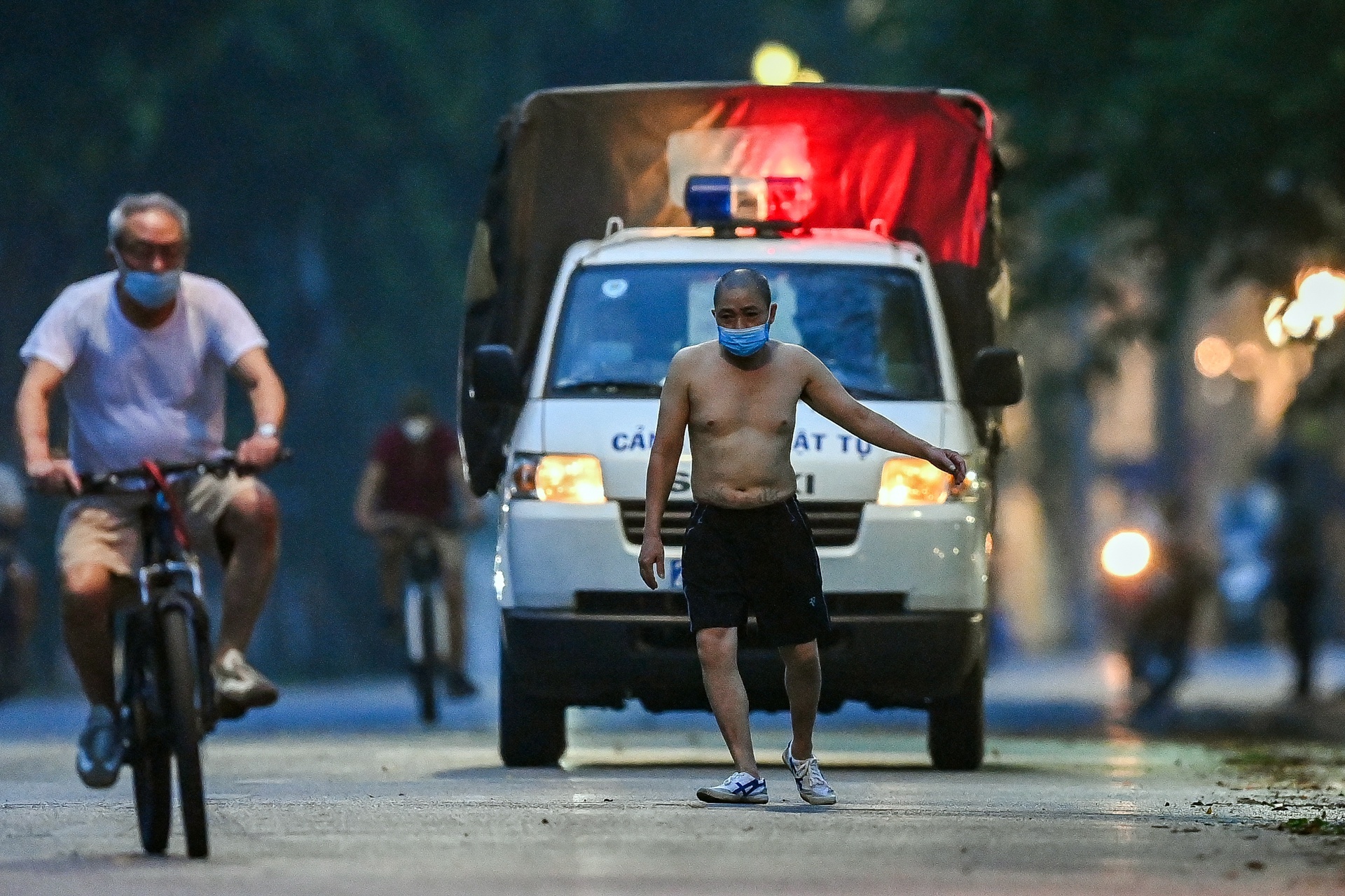 Một người đàn ông và nhiều người khác đi bộ dưới lòng đường. Xe cảnh sát đi phía sau kêu gọi họ rời khỏi khu vực. Khi bị nhắc nhở họ lại đi sang phía bên đường đối diện để tiếp tục tập, không chịu ra về. Sau khi Hà Nội nới lỏng giãn cách xã hội từ ngày 21/9, nhiều người dân đi bộ, đạp xe thậm chí chui xuống hầm để tập thể dục trong khi các hoạt động này chưa được phép. Ảnh: Việt Linh.