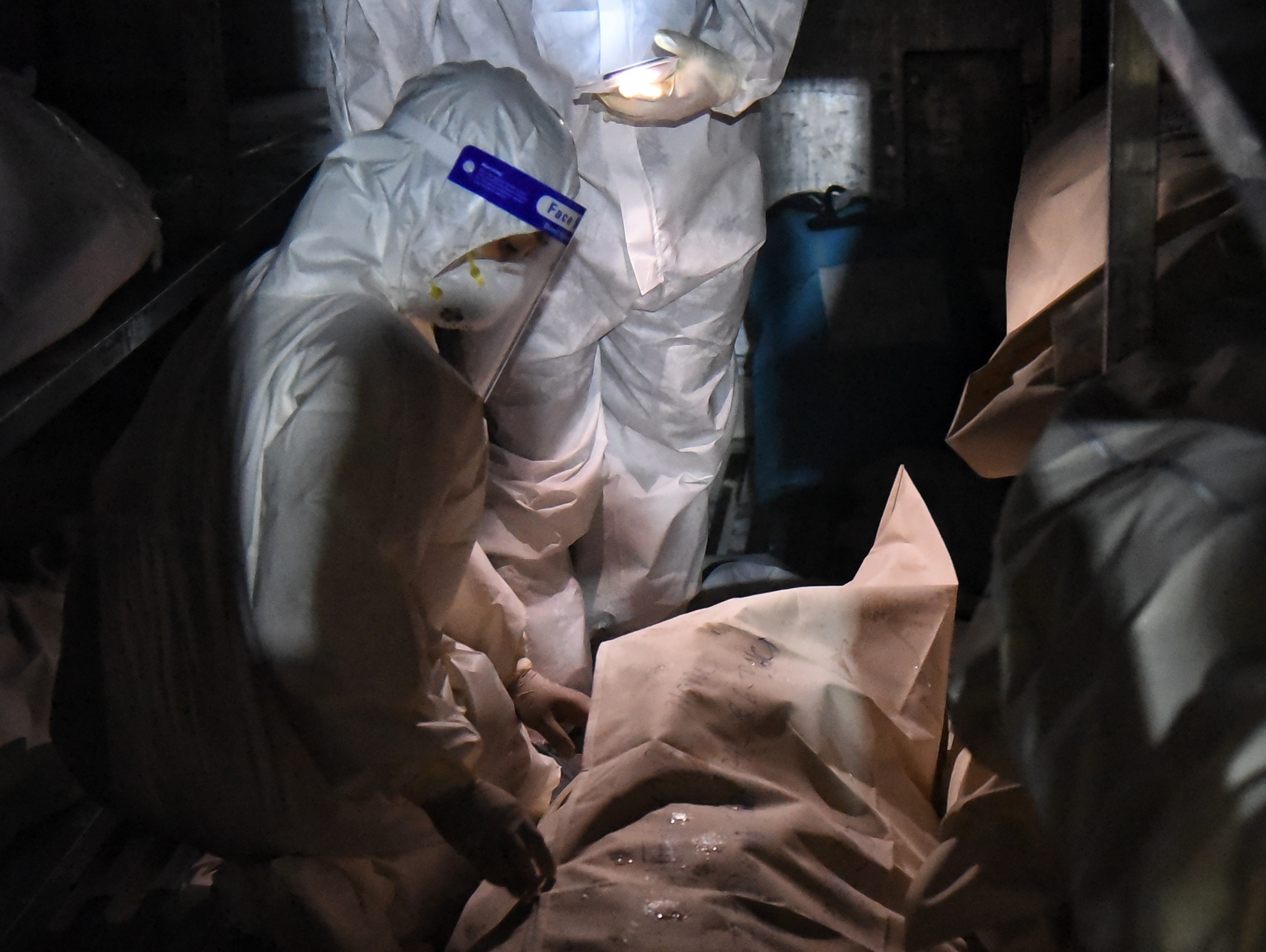 Dưới ánh đèn flash từ chiếc điện thoại của bác sĩ Nguyễn Hồng Khánh Duy, bác sĩ Hiền lặng nhìn khuôn mặt chồng qua một lớp nylon trong suốt. Khoảnh khắc cuối cùng của 2 vợ chồng chỉ kéo dài vài giây. Nữ bác sĩ im lặng bước ra khỏi thùng container, đôi mắt mở to vô định... Ảnh: Ngọc Tân.