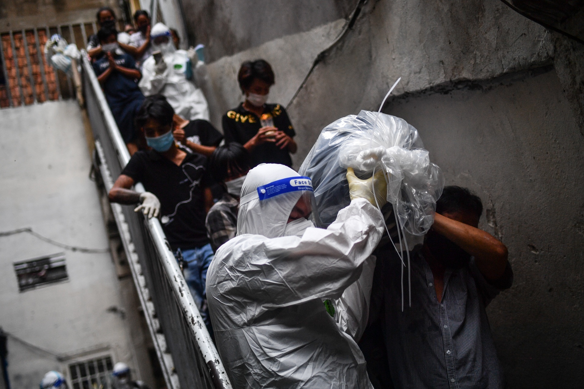 Căn nhà có người mất nằm trên lầu 2 của một căn chung cư cũ tại quận 5, TP.HCM. Từ lan can, hàng chục người từ trẻ đến già cùng ngó đầu xuống, quan sát đội mai táng. Bên trong, người phụ nữ quay đi khi thấy đội mai táng bọc kín nylon và khiêng thi thể chồng bà ra ngoài, ông mất vì Covid-19. Ảnh: Duy Hiệu.