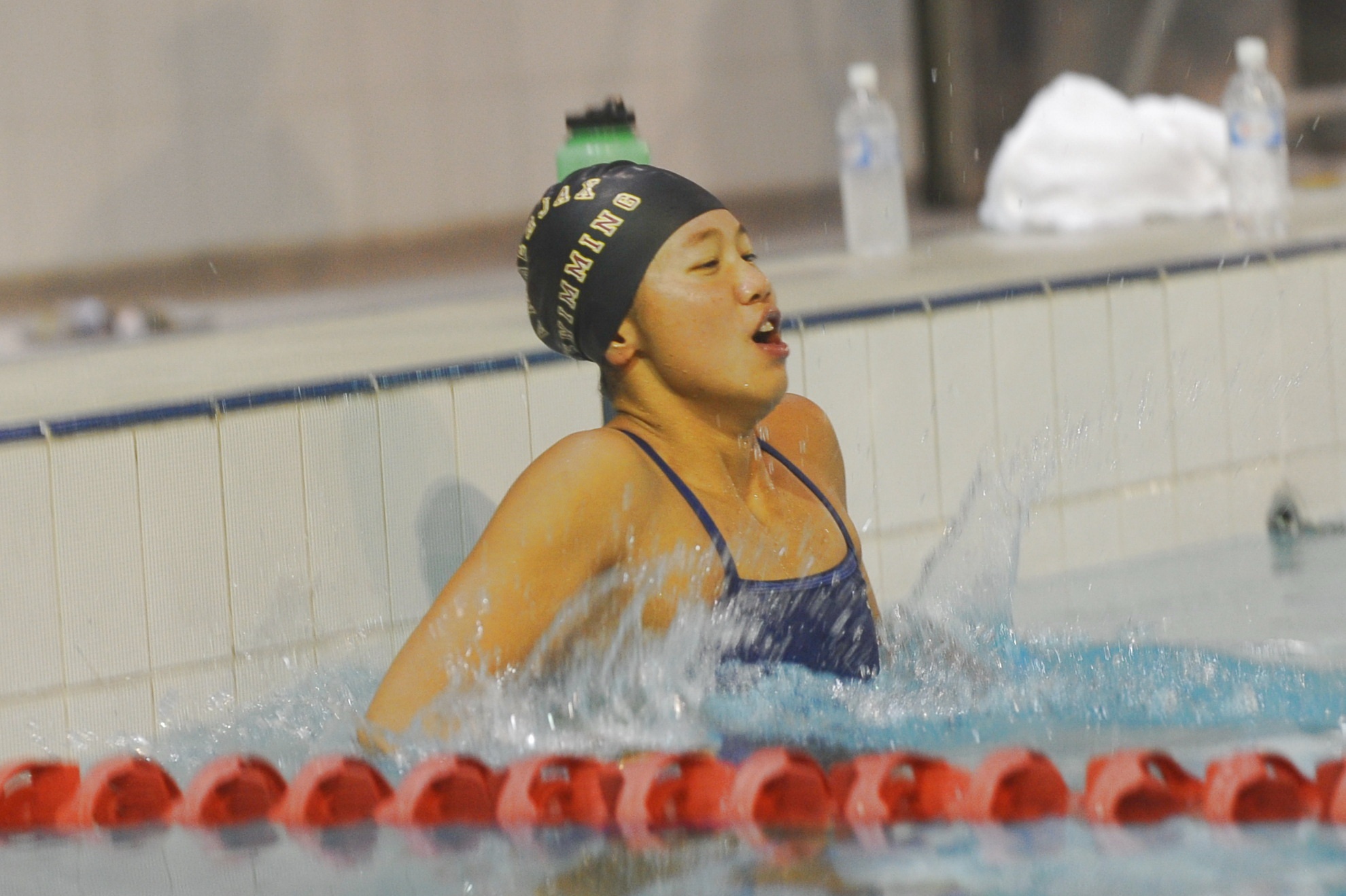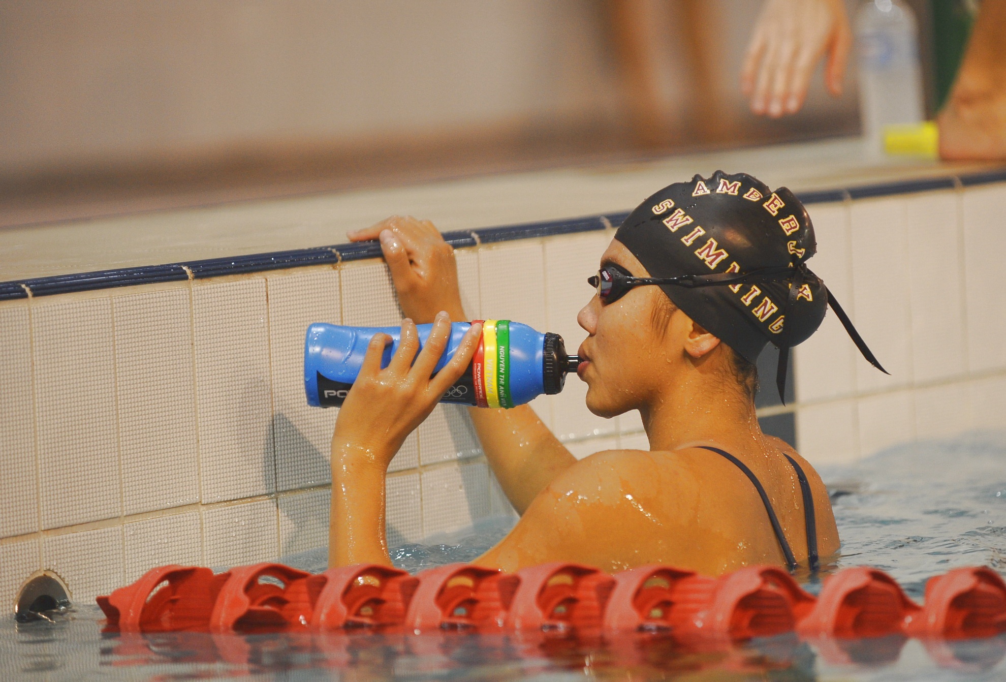 | Ánh Viên tranh thủ bổ sung nước cho cơ thể. |