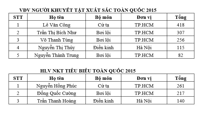 | Danh sách HLV, VĐV người khuyết tật xuất sắc toàn quốc. |