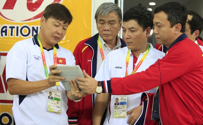 | HLV Đặng Anh Tuấn (trái) cùng lãnh đạo đoàn Việt Nam đã khiếu nại nhưng không thành công. |