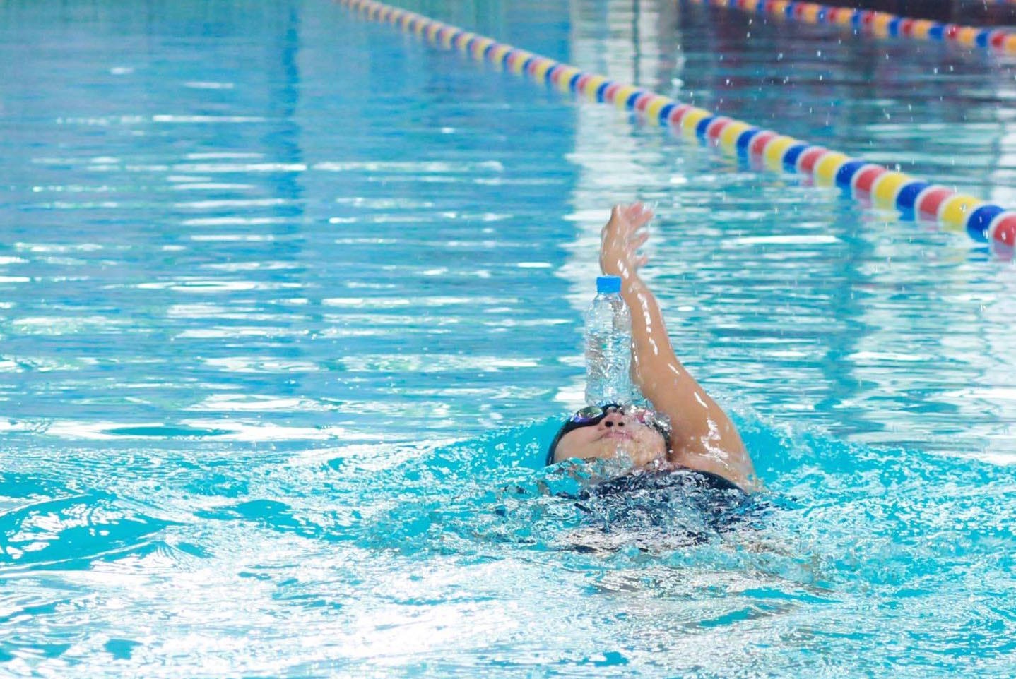 | Ánh Viên giữ thăng bằng chai nước trên trán sau hàng trăm mét bơi ngửa. HLV Đặng Anh Tuấn cho biết đây là một trong những bài tập thường ngày của Ánh Viên khi tập huấn tại Mỹ. Ảnh: Hiếu Lương. |