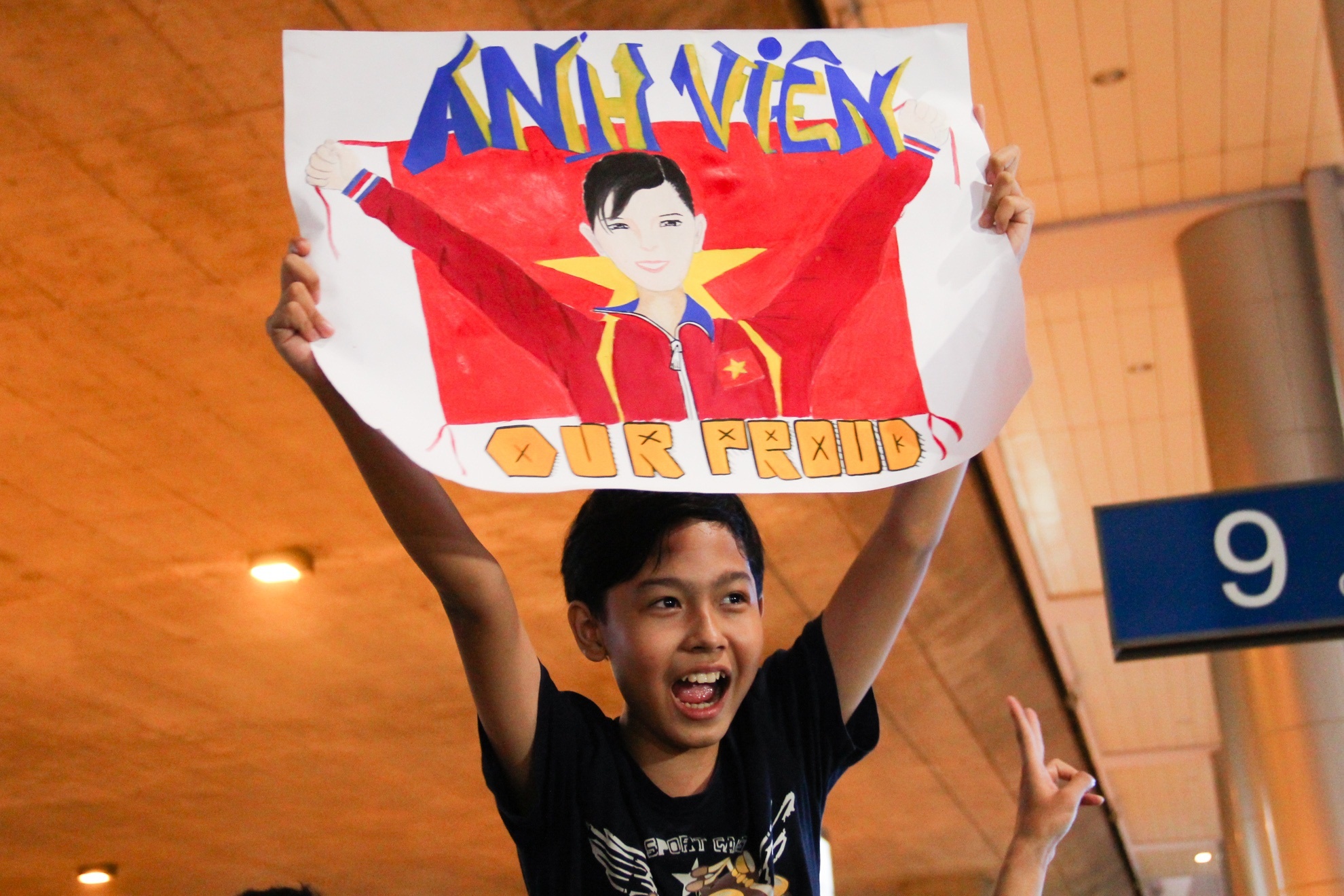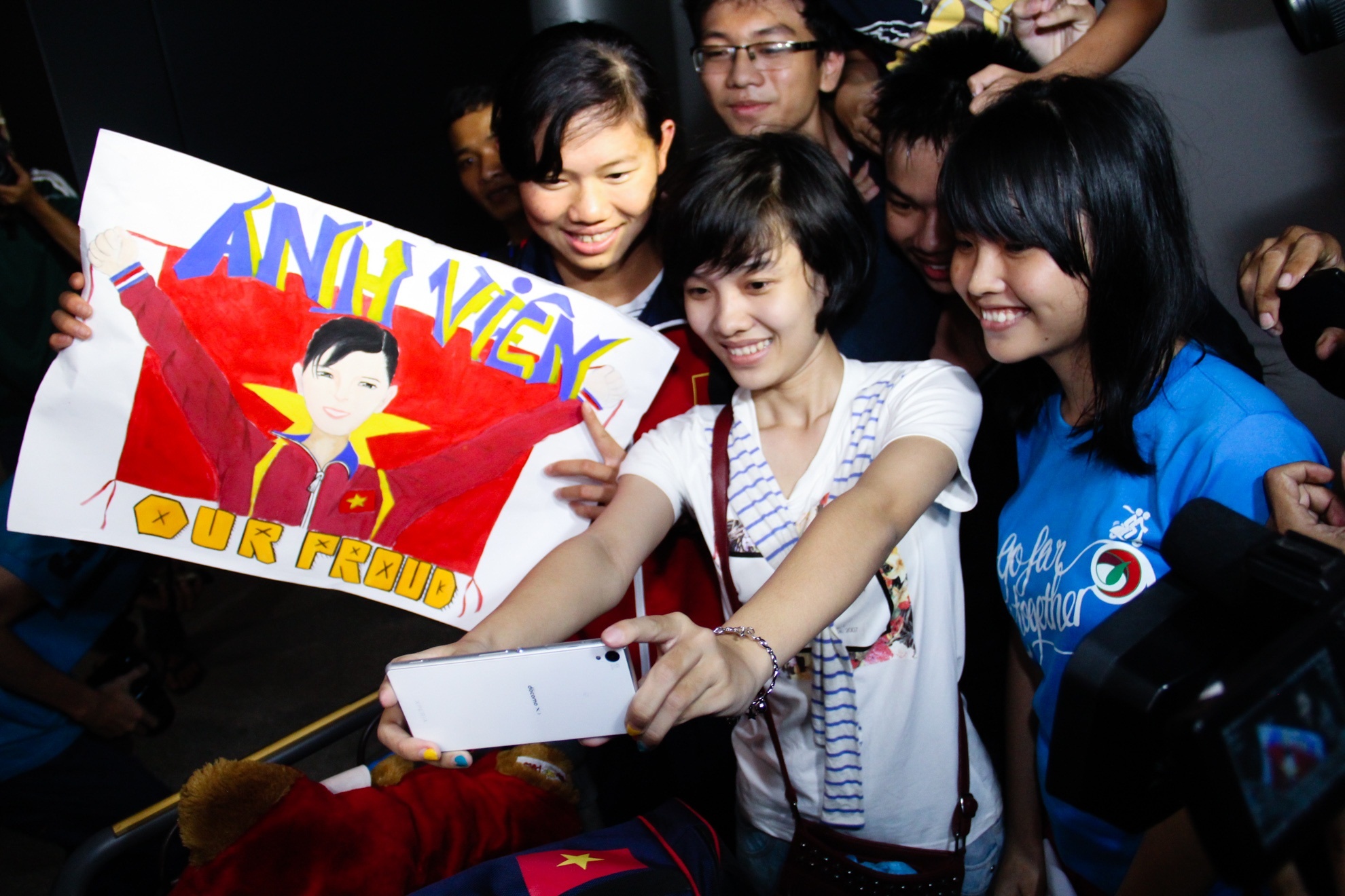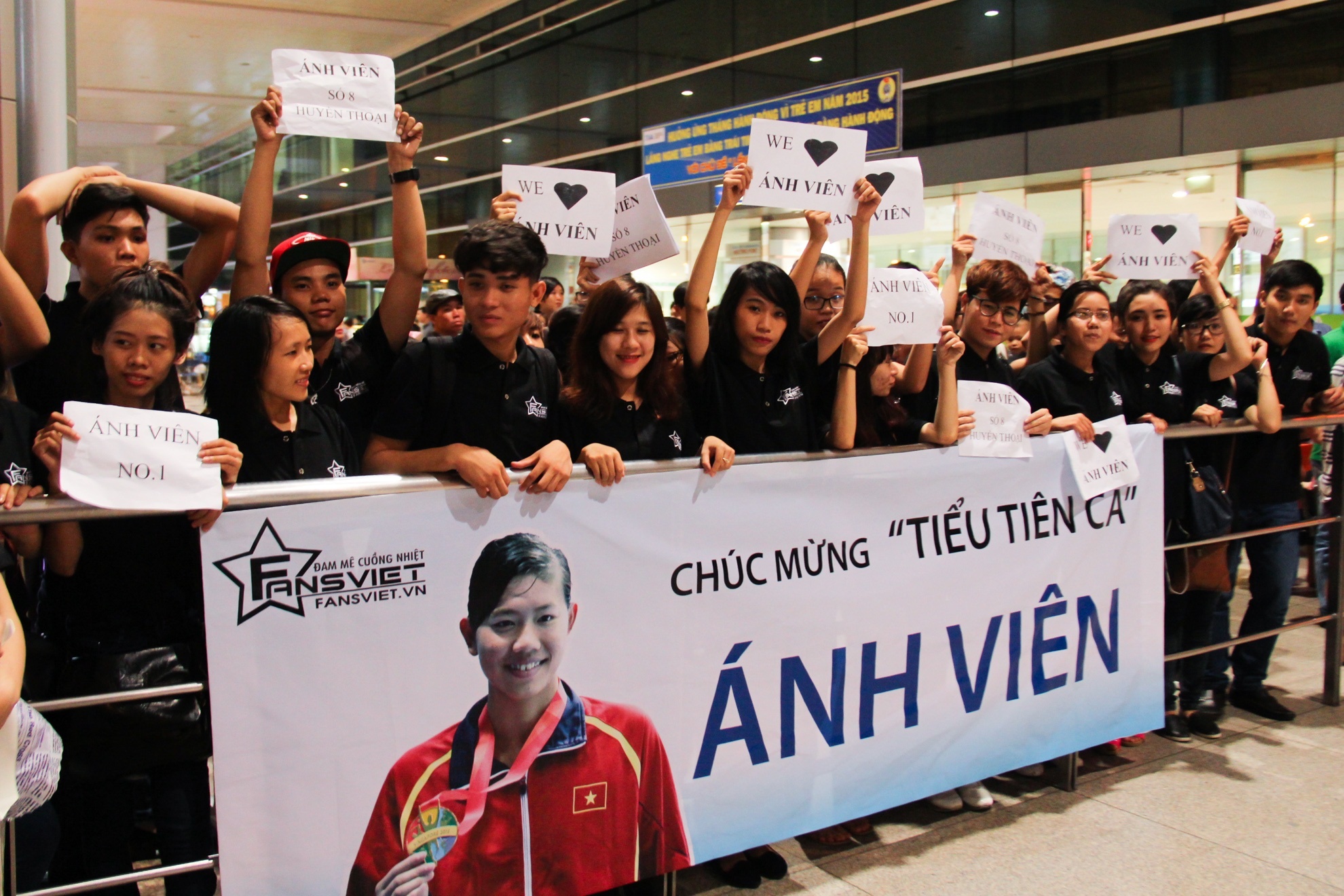 Đông đảo người hâm mộ, phần lớn là các bạn trẻ, chờ Ánh Viên ở cửa ra sân bay quốc tế để chia vui, gặp gỡ thần tượng. Ánh Viên đang là từ khóa "hot" trên các diễn đàn, mạng xã hội và truyền thông.