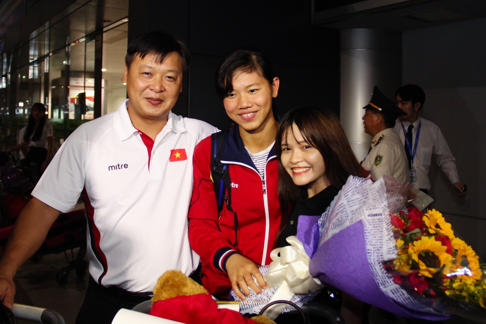 | Thầy trò Ánh Viên vui mừng với sự đón tiếp của truyền thông và người hâm mộ. |