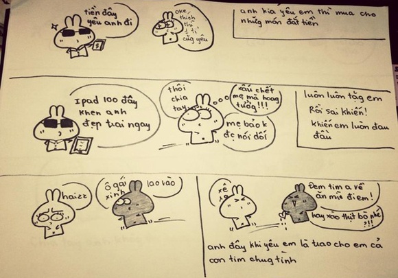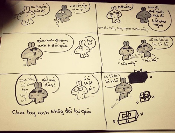 | Thảo Vân, cô nữ sinh xinh đẹp trường ĐH Kinh Tế Quốc Dân đã chia sẻ những hình ảnh vẽ thỏ hoạt hình rất ngộ nghĩnh liên quan đến chủ đề nóng hổi trên mạng xã hội thời gian vừa qua: "Chia tay, đòi quà". |