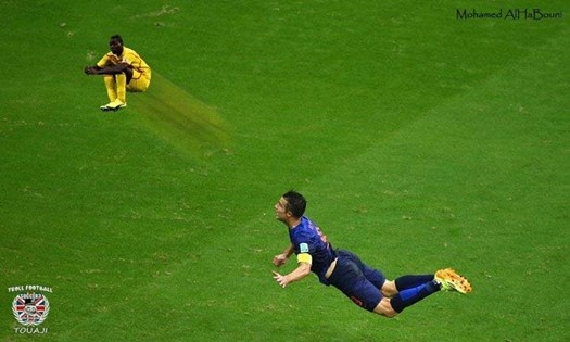 | Balotelli trở thành quả bóng cho Van Persie tiêu khiển tại World Cup 2014. |