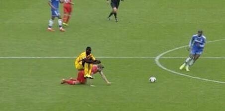 | Gerrard cõng Balotelli trên lưng trong cú ngã dẫn đến mất ngôi vô địch ở mùa giải 2013-2014. |