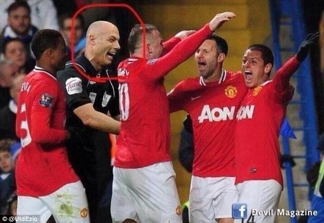 Một trong những tấm ảnh Howard Webb vui mừng sau khi M.U có được bàn thắng.