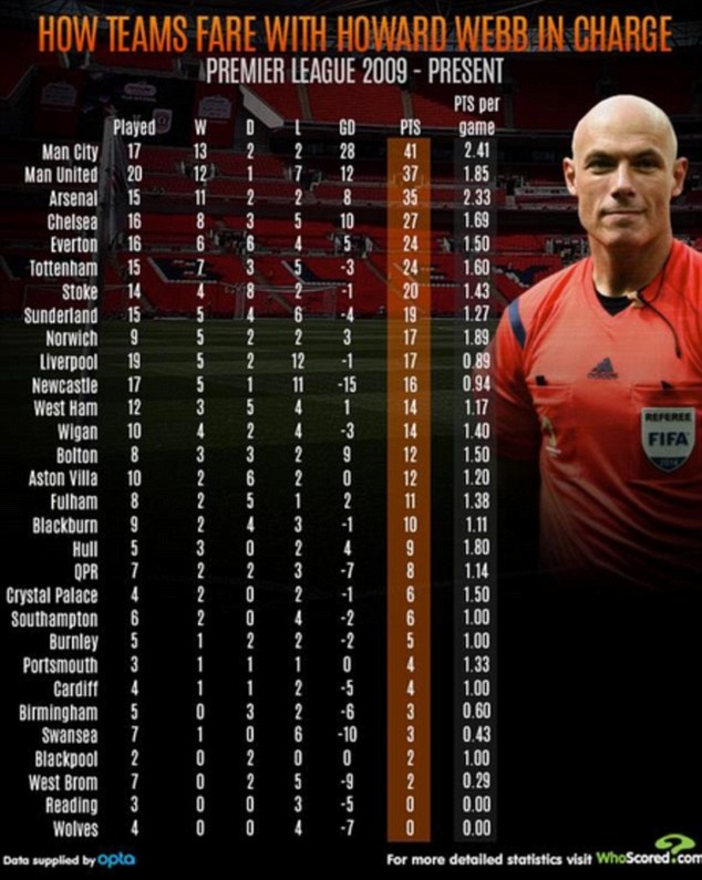 Tuy nhiên, thống kê thực tế cho thấy không phải M.U, Man City mới là đội giành được nhiều điểm nhất trong những trận đấu Howard Webb cầm còi. Theo Daily Mail, Howard Webb sẽ chuyển sang cương vị mới là giám đốc kỹ thuật của Hiệp hội trọng tài quốc tế.